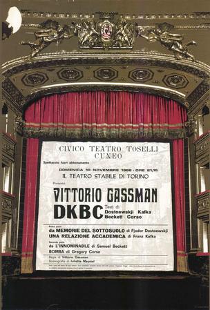 DKBC (1968/69) ripresaRecital di Vittorio GassmanScenografia di Juliette MaynielQuattro monologhi da: Memorie del sottosuolo, di Fjodor Dostoevskij, Una relazione accademica, di Franz Kafka, L’innominabile, di Samuel Beckett, Bomba, di Gregory Corso.Con Vittorio Gassman.DebuttoCuneo - 10 Novembre 1968 - Teatro Toselli (Cuneo)DKBC (1968/69) - ManifestoVedi ancheDKBC (1967/68)